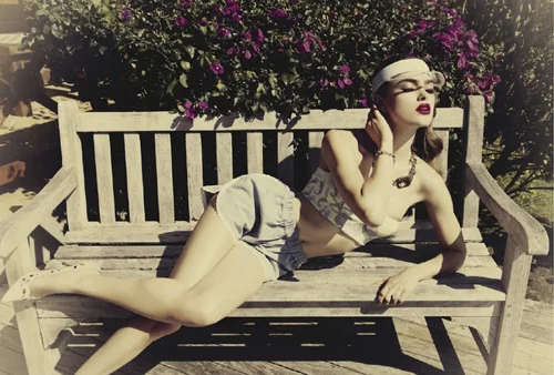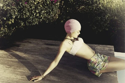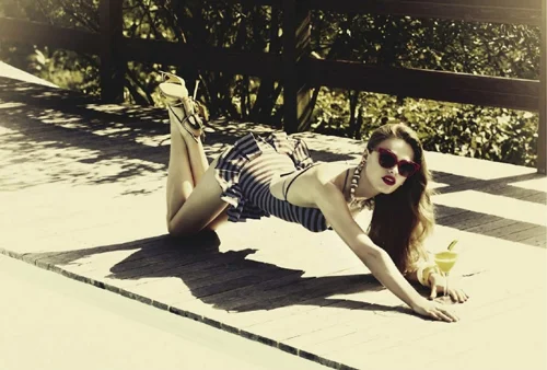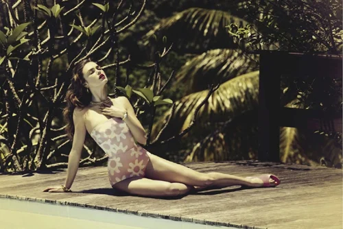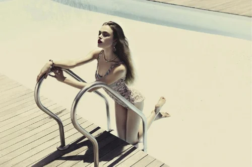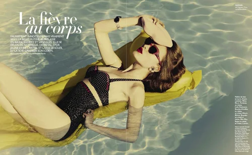 /Sophie Vlaming is a retro vision of style wellness in Richard Bernardin’s poolside story ‘La Fievre au Corps’. Candice Fauchon styles the retro beach babe sportswear story for Grazia France’s August issue.