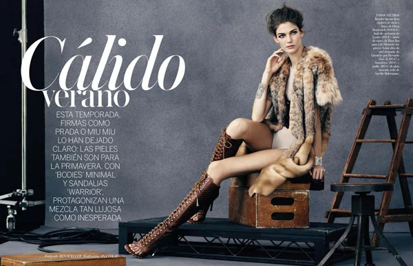 /Kendra Spears is 70s sensuous, wrapped in fur, soft suede and statement jewelry, styled by Ana Tovar, for Ben Weller’s sexy editorial ‘Calido Verano’ for Vogue Spain’s February issue. This studio editorial sizzles./Hair by Chi Wong; makeup by Hiromi Ueda.