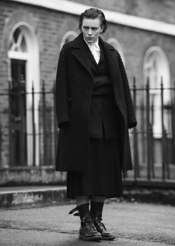 /Model Erika Linder masters the art of the masculine gaze in ‘Man Up’, lensed by Stefan Zschernitz for Twin Magazine #9 Fall 2013. Hanna Kelifa chooses a somber, solid range of impeccably cut clothes for this black and white, androny gender bender.