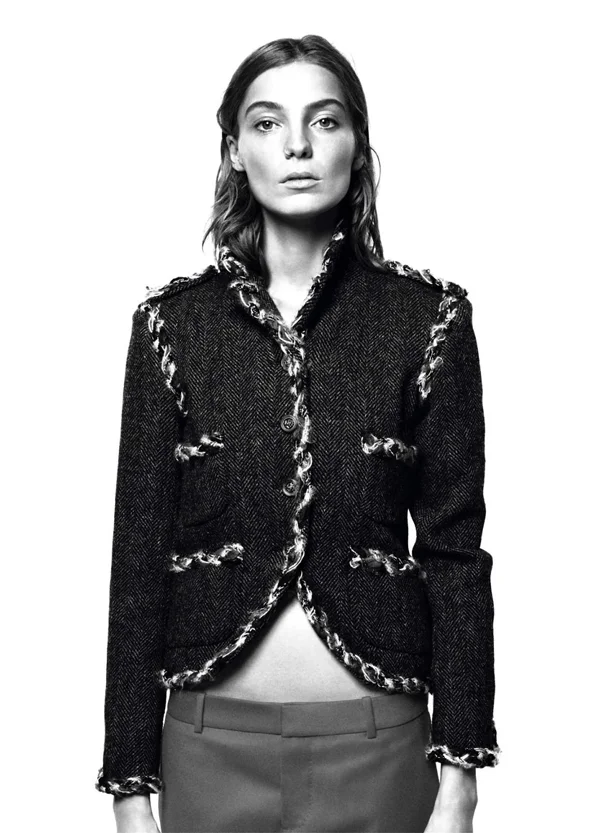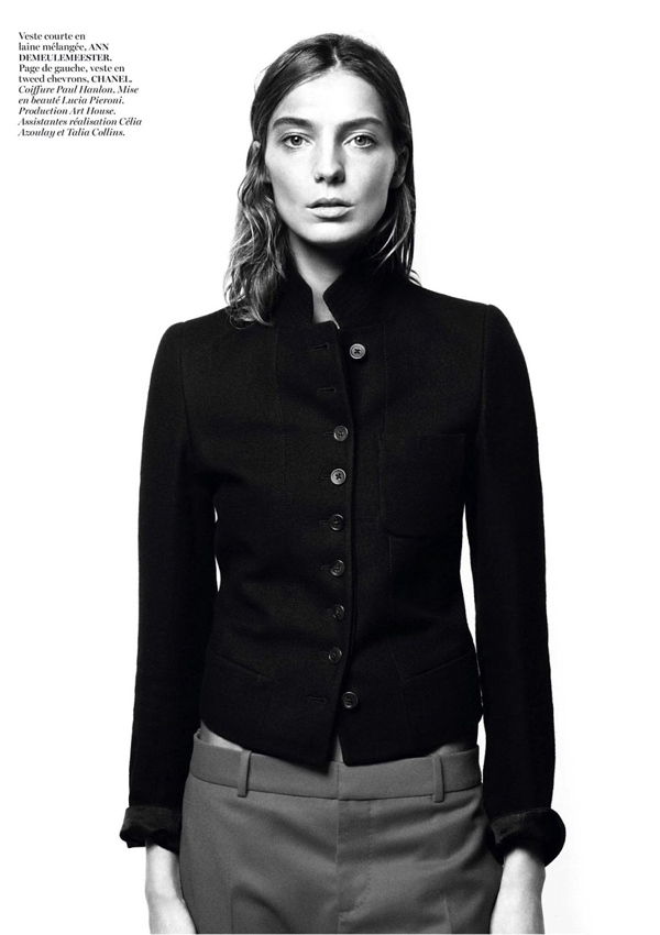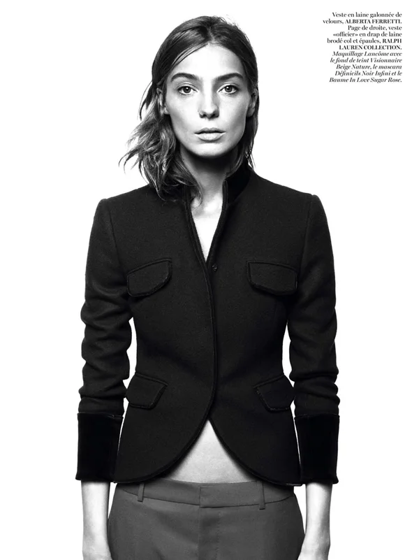 /Daria Werbowy trades in romantic formality for regal jackets and trousers in a dressed-up nod to heroic swashbuckler types ready to rescue damsels in distress. Emmanuelle Alt styles the studio shots lensed by David Sims for Vogue Paris August issue as ‘Londres En Majesté./ Hair by Paul Hanlon; makeup by Lucia Pieroni
