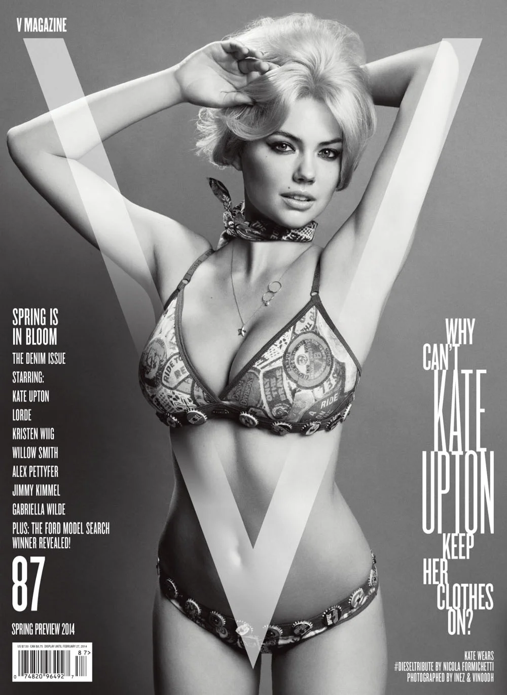 Kate fronts the new issue of V Magazine, dishing on ‘the ladies’ while admitting that she is doing the ‘cha-cha-cha’ with Maksim Chmerkovskiy from ‘Dancing With The Stars’. Lensed by Inez & Vinoodh, Kate is styled by Nicola Formichetti wearing Diesel Tribute handcrafted denim, sexy lingerie and nothing at all in ‘Why Can’t Kate Upton Keep Her Clothes On?’.