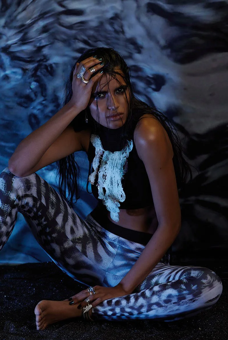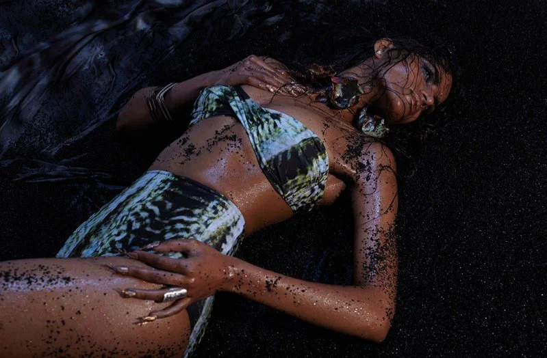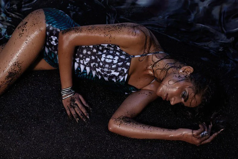 /UK swimwear brand MONA launches its digital prints collection AELLAI inspired by the sea. Model Preeti Dhata is a spectacular mermaid as she makes coverage in the form of high waists, bandeau tops and one-piece suits very sensual. The jewelry sparkles and even sand glimmera on Preeti.