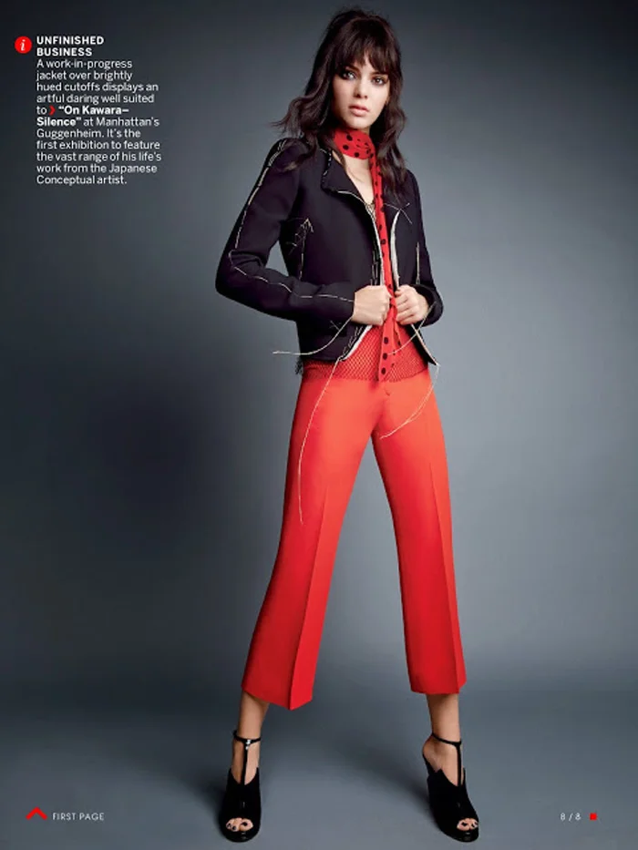 /Top model Kendall Jenner is styled in long-legged trousers that are ‘High & Mighty’ by Tabitha Simmons. Photographer Patrick Demarchelier is in the studio for Vogue US February 2015.