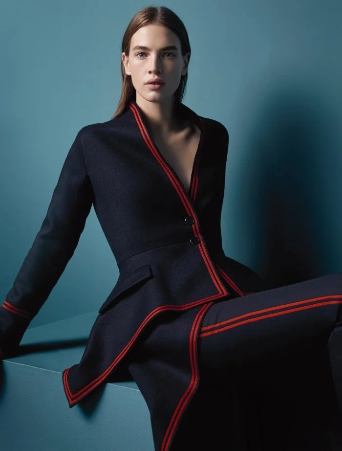 /Model Crista Cober is styled by Samuel Francois in ‘Le Rouge et le Noir’, streamlined, easy looks in black and red. Photographer Jacob Sutton is in the studio for Numero #167 October 2015./ Makeup by Lotten Holmqvist; hair by Cyndia Harvey