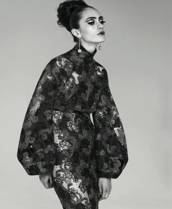 /Stylist Taryn Bensky chooses embroidered elegance and sleek, linear sophistication for model Marine Deleeuw’s images by Angelo d’Agostino for Harper’s Bazaar Serbia October 2015./ Hair by Deycke Heidorn; makeup by Aya Komatsu