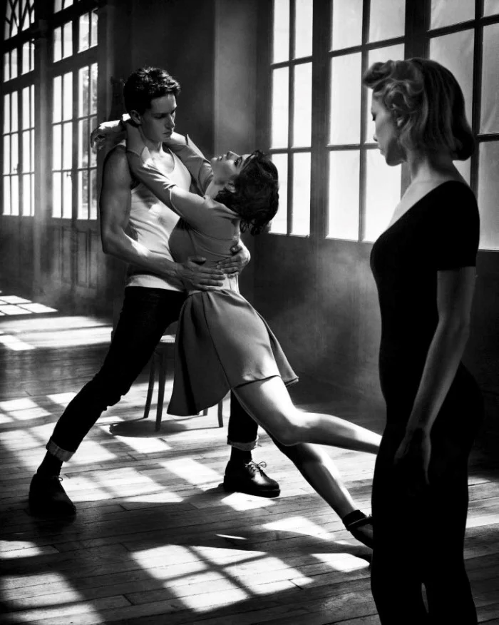 /Models Isabeli Fontana, Charlotte Ranson, Juliette Hilaire, Letizia Galloni, Yvon Demol, Germain Louvet, Cyril Chokroun, Matthieu Botto, Yannick Bittencourt, and Isaac Lopes Gomes grease their dance moves in a 'Suggestions' editorial styled by Valentina Serra. Sensual vision photographer Vincent Peters captures the retro fashion energy for Vogue Italia October 2015./ Hair by Perrine Rougemont; makeup by Christine Corbel
