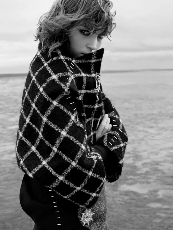/Model Arizona Muse wears cool-weather, pedigree sportswear elegance styled by Anne-Marie Curtis in 'Dream Weaver'. Kerry Hallihan captures the lonely beach lover for Elle UK November 2015./ Hair by Lok Lau; makeup by Kirstin Piggot