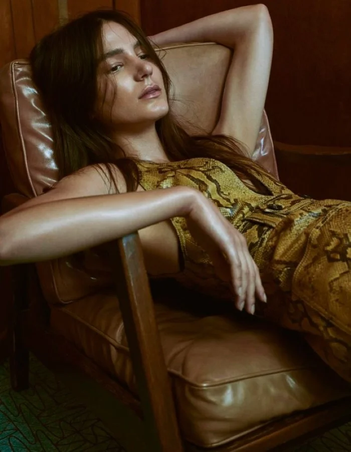 /Model Mijo Mihaljcic delivers a fall gourmet feast, styled in a palette of butternut squash, burgundy, and aubergine from Chloe, Calvin Klein, Celine, Louis Vuitton, Chanel and more by Nina Sterghiou. Photographer Sebastian Sabal-Bruce captures 'Mountain Hideaway' for Interview Magazine October 2015./ Makeup by Aya Komatsu; hair by Blake Erik