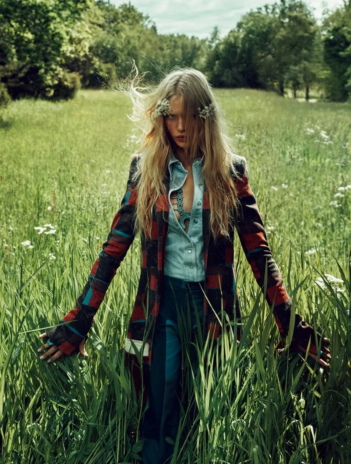 /The lovely model Camilla Christensen embraces slow living and a back to the land lifestyle anchored in more traditional values, lensed here by Boe Marion. Stylist Lisa Lindqwister chooses casual country looks with plenty of homespun appeal for Elle Sweden’s October issue./ Hair by Ali Pirzadeh; makeup by Ignacio Alonso