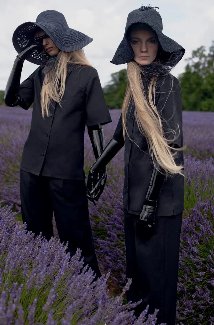 /Models Frederikke Sofie and Lucan Gillespie create black magic fashion drama styled by Robbie Spencer. London photographers Sean + Seng create a dramatic and intriguing landscape against fields of lavendar for Dazed Magazine Fall/Winter 2015./ Hair by Neil Moodie; makeup by Gemma Smith-Edhouse