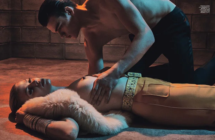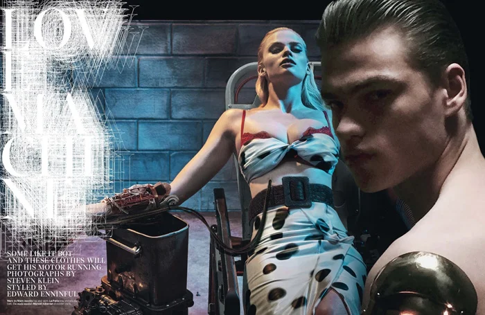 Models Lara Stone, Filip Hrivnak and Bryce Thompson capture the sensual eye and imagination of photographer Steven Klein in ‘Love Machine’. Edward Enninful styles Lara in sexy, sleek daytime clothes for W Magazine March 2015./ Makeup by Mark Carrasquillo; hair by Akki