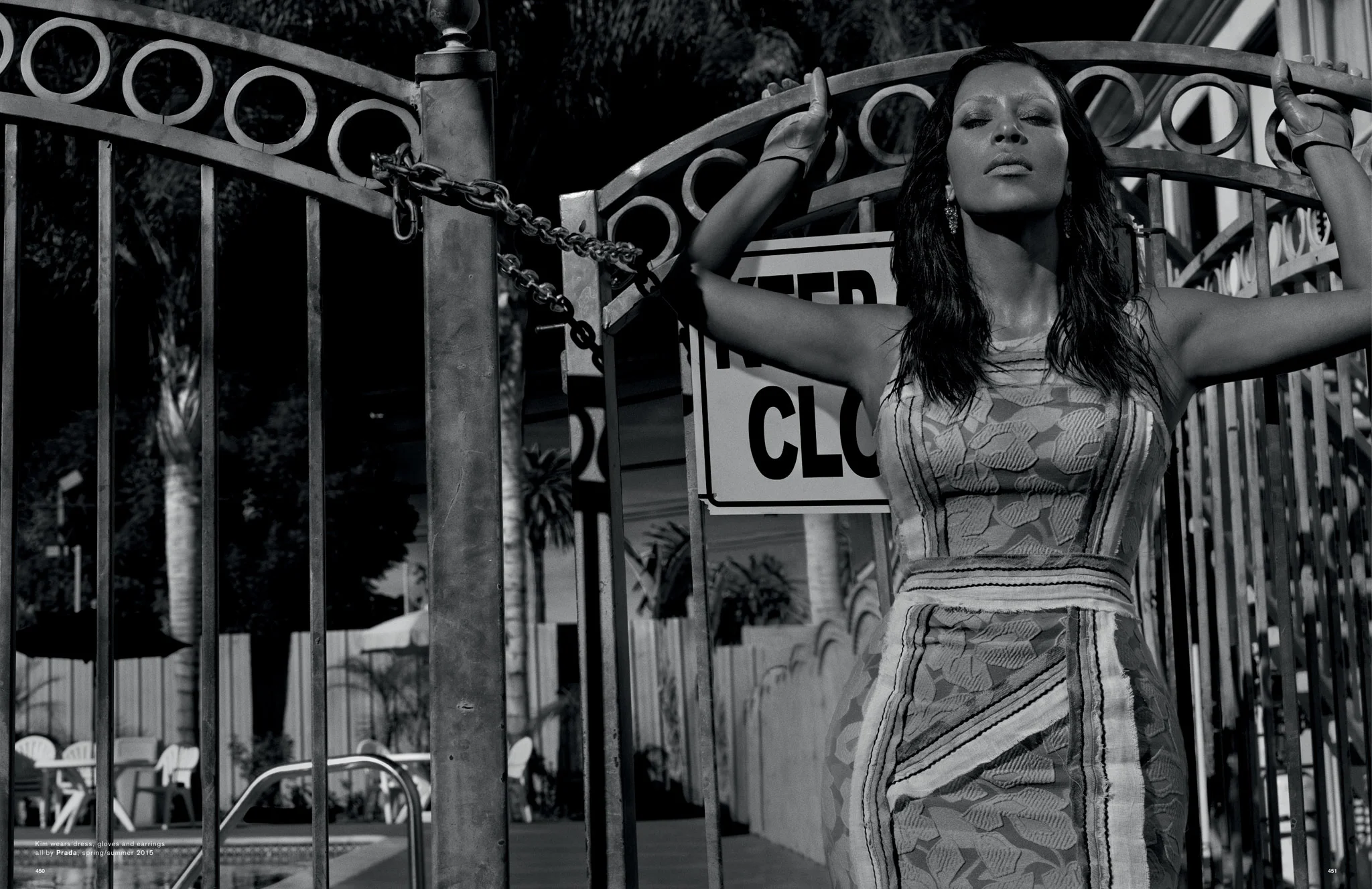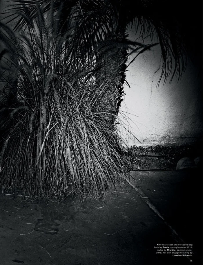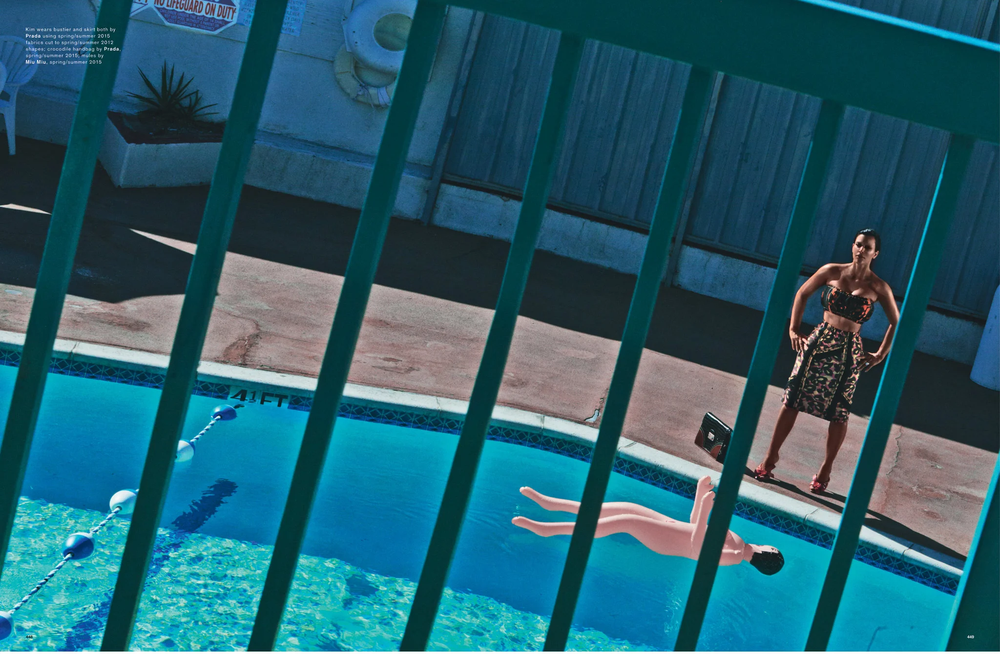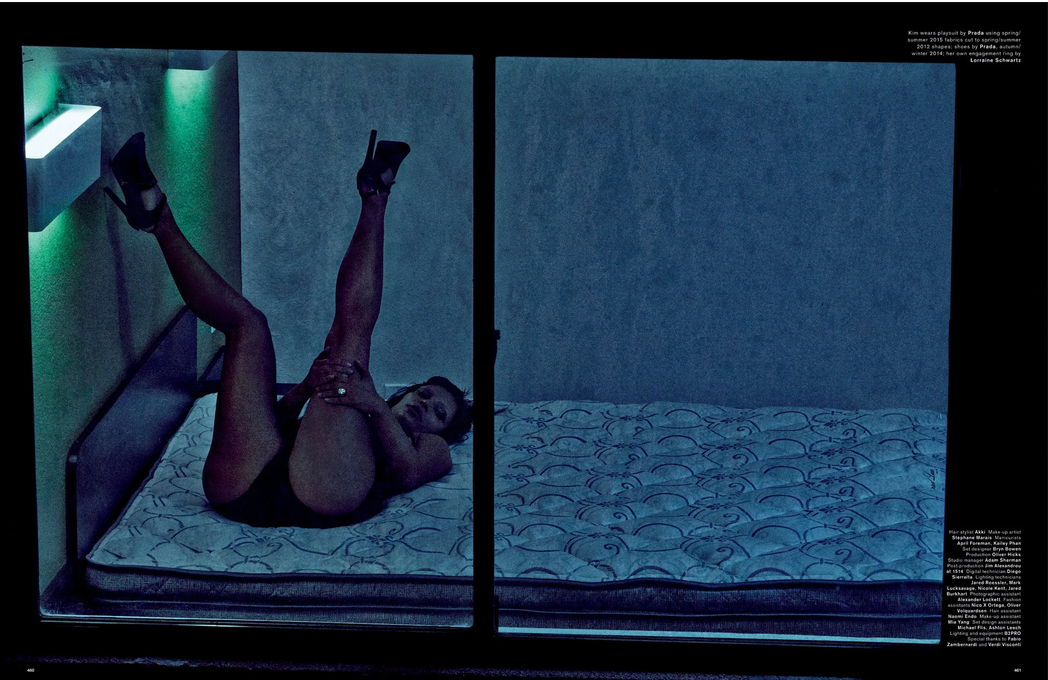 /Kim Kardashian displays her sexual assets in unabashed photos by Steven Klein. Kardashian does wear some clothes in ‘Kim Wears Prada’ — fashions from the spring 2015 collection married to customized styles from the spring 2012 collection. With no more fabric, Miuccia had to improvise. Katie Grand styles the shoot for her LOVE Magazine 13 Spring/Summer 2015.
