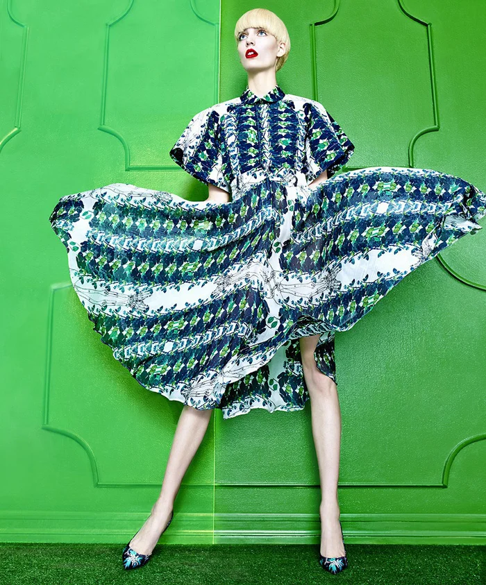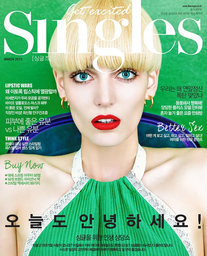 /Model Zuzanna Bijoch is boldly beautiful, styled by Michela Buratti in streamlined shapes in vivid blues and greens. Photographer Hong Jang Hyun is in the studio, flashing ‘Green Gate’ for Singles Korea March 2015./ Hair by Nicolas Eldin; makeup by Yumi Lee