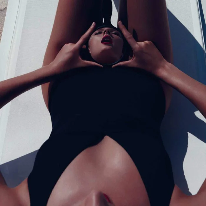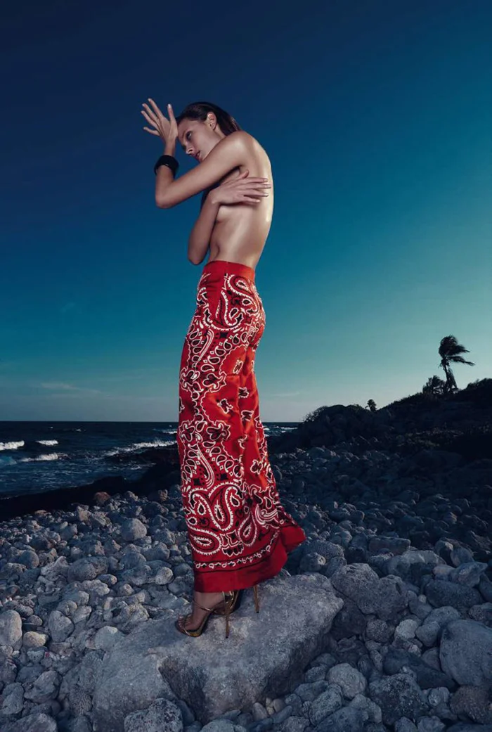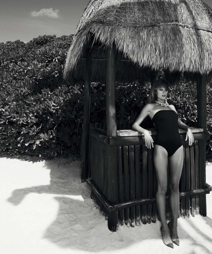 /Top model Constance Jablonski is styled in hot weather beach clothes by Juan Cebrian. Photographer Nagi Sakai snaps the beach babe in ‘Estado de Gracia’ for Harper’s Bazaar Spain May 2015./ Hair by Pasquale Ferrante; makeup by Makky P