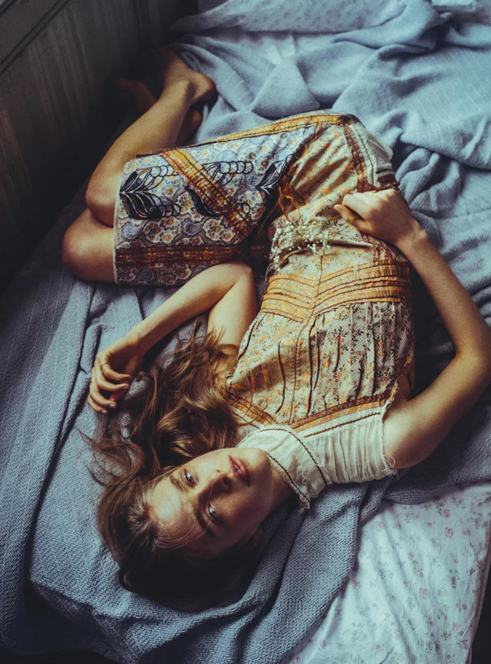 Model Hedvig Palm wears romantic vintage looks styled by Katie Mossman in ‘Sunshine Daydream’. Photographer Sebastian Kim captures the ruffled, embellished looks for Vogue Australia./ Hair by Bok-Hee; makeup by Kristi Mattamoros