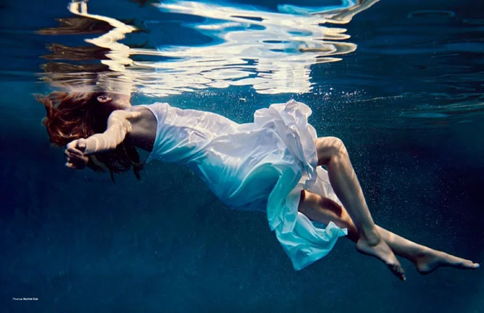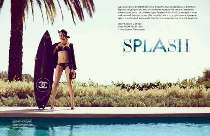 /The always sensual Ana Breatriz Barros is poolside before plunging into cooler waters for the July-August issue of L’Officiel Russia. The cover girl is styled by Erica Pelosini in Chanel, Rachel Zoe, Intimissimi and more in images by Mike Rosenthal./ Makeup by Bruce Grayson; hair by Diane Dusting