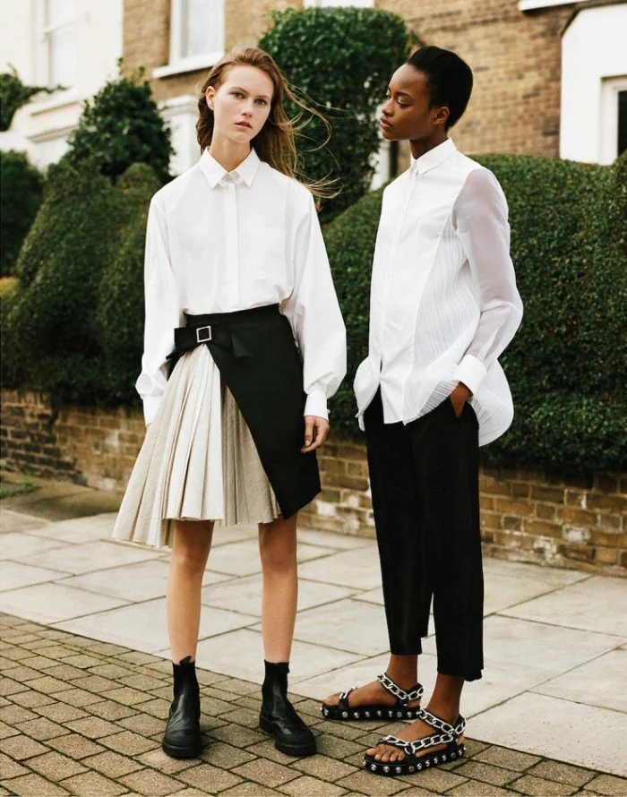 /Models Mayowa Nicholas and Julie Hoomans are styled by Ondine Azoulay in black and white smart girl separates for 'Two For The Road'. Photographer Matteo Montanari is behind the lens for WSJ Magazine January 2016 / Hair by Alex Brownsell; makeup by Lucy Bart