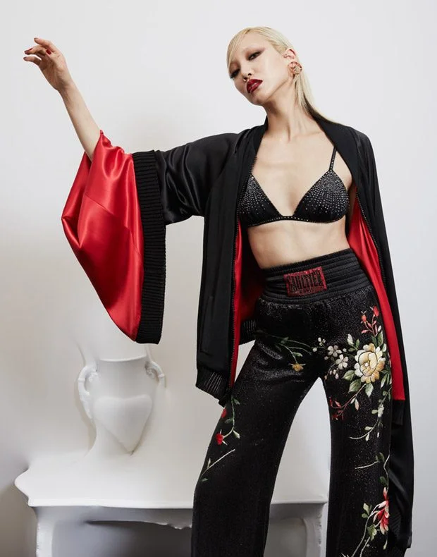 /Top model Soo Joo Park wears Jean Paul Gaultier couture styled in red-white and black high-voltage looks by Azadeh Zoraghi. Photographer Jason Kim captures the cover story for Narcisse Magazine Fall-Winter 2016./ Hair by Olivier Lebrun; makeup by Damian Garozzo