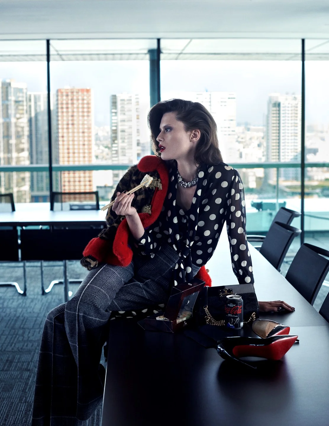 /Model Elena Melnik is styled by Alberto Zanoletti in 'Business Class', lensed by David Burton for Elle Italia, Spain and Germany November 2016./ Hair by Jean Luc Aramin; makeup by Tiina Roivainen