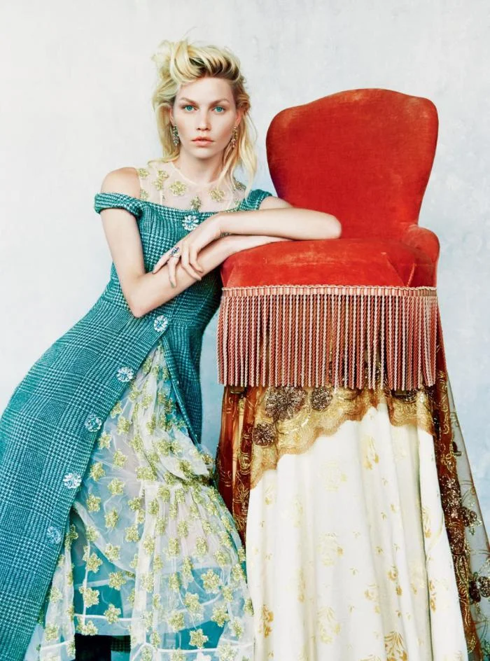 /Top model Aline Weber is styled by Charlie Harrington in an eclectic fashion mix 'Lady Dada'. Photographer Erik Madigan Heck is in the studio for Harper's Bazaar UK November 2016./ Hair by Kota Suizu; makeup by Polly Osmond