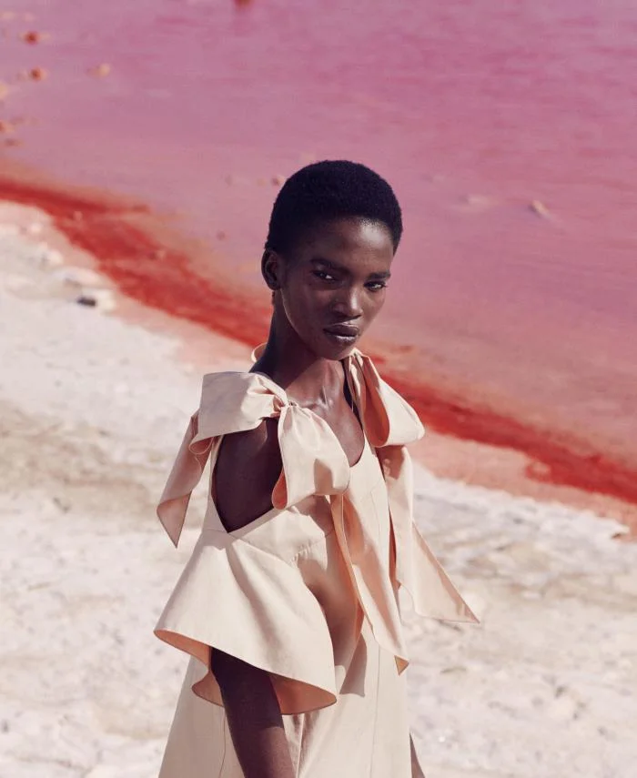 /Model Aamito Lagum is styled by Joanna Hillman in 'Think Pink' lensed by Daniel Riera for Harper's Bazaar US Dec 2016/Jan 2017./ Hair by Noelia Corral; makeup by Monica Marmo