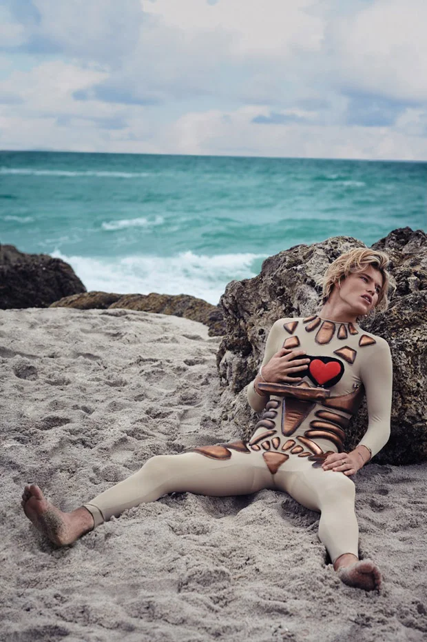 /(Continued from Part 1). Top models Natasha Poly and Jordan Barrett continue as modern nomads, styled by Paige Reddinger in a gender-blending (especially for Jordan) editorial for the debut issue of Front Row Miami. Photographer Sebastian Faena flashes the futuristic family with a passion for vivid self-expression in this two-part set of engaging images.