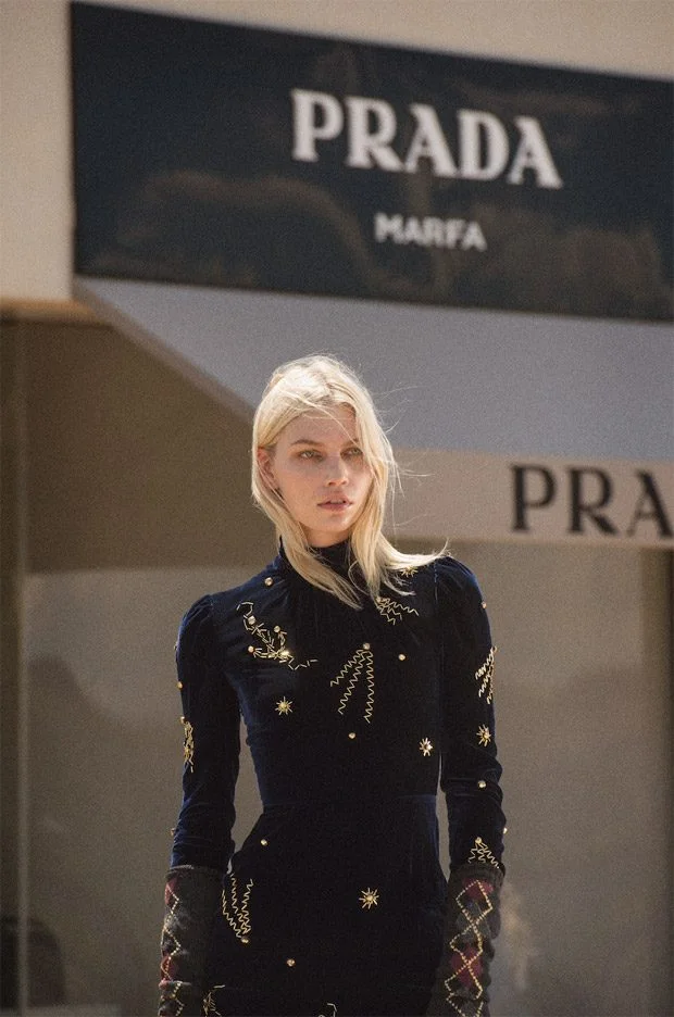 /Supermodel Aline Weber fronts '4,6,x7,6m Special Prada at Prada Marfa, Tx', styled by Alva Galim. Photographer Marc Pilaro captures Aline in "the best little art colony in Texas" for ODDA Magazine's Spaces issue.