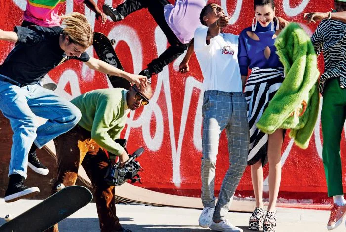 /Top, top model Kendall Jenner shares a lightning bolt of colorful optimism, going wheels up in crayola spring looks alongside talents Travis 'Taco Bennet', Tyler the Creator, Ryder McLaughlin and Mikey Alfred. Tonne Goodman styles Kendall with Michael Philouze on menswear. Photographer Mario Testino is streetside for 'Rise & Shine' in Vogue US January 2016./ Hair by Christiaan; makeup by Erin Parsons