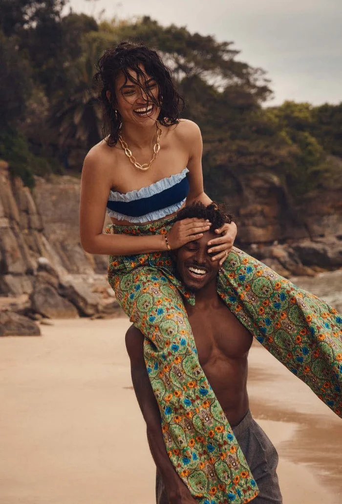 /If frigid temperatures blanket much of America, summer is coming to Elle Austalia, as model Shanina Shaik & DJ Ruckus get cozy in hot weather looks styled by Emma Kalfus. Photographer Georges Antoni goes to the beach for a good time in 'Summer of Love'./ Hair by Diana Gorgievski; makeup by Noni Smith