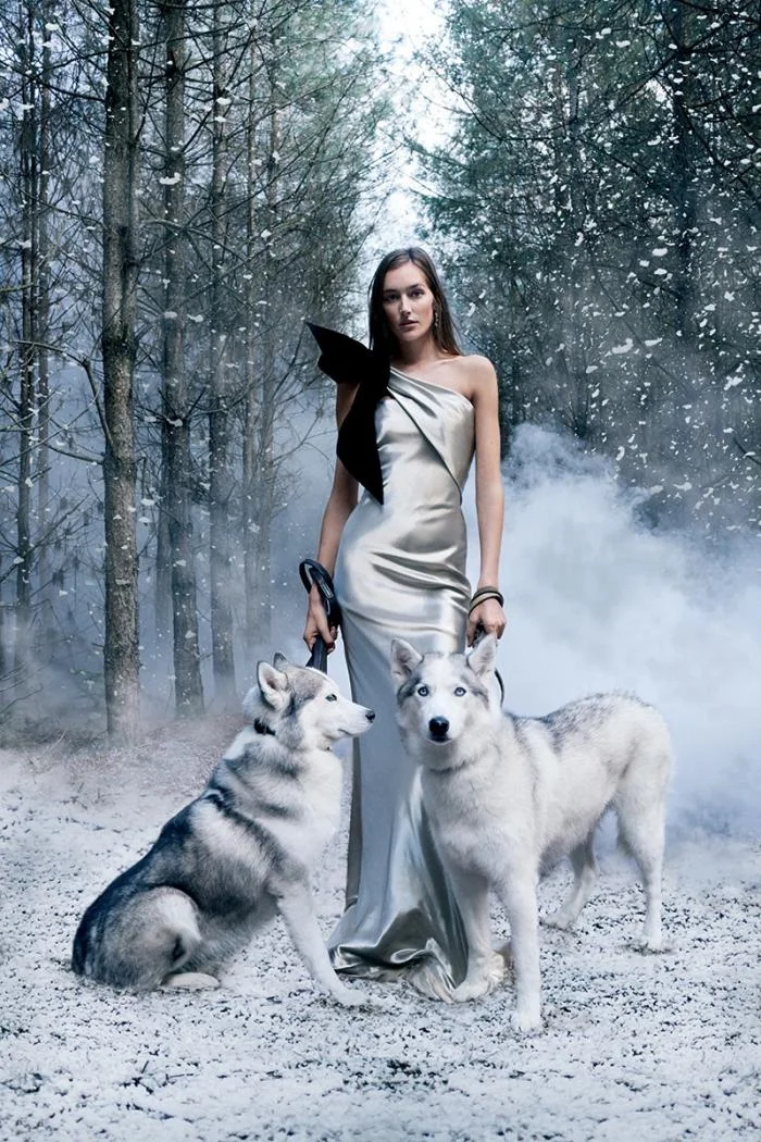 /Top model Josephine Le Tutour wears Chanel Couture, Atelier Versace, Valentino Haute Couture, Armani Prive and more in 'A Winter's Tale', styled by Charlie Harrington. Photographer Alexandra Sophie captures the snowy fashion landscape for Harper's Bazaar UK January 2016./ Hair by Polly Osmond; makeup by Alice Sheppard Fidler