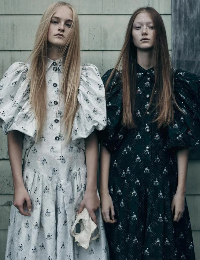 /Models Jean Campbell and Sara Grace are styled by Ludivine Poiblanc in old-fashioned mini prints and ruffles for 'Flowers in the Attic'. Photographer Gregory Harris captures the duo for Interview Magazine December 2016-January 2017./ Hair by Rudi Lewis; makeup by Karan Franjola