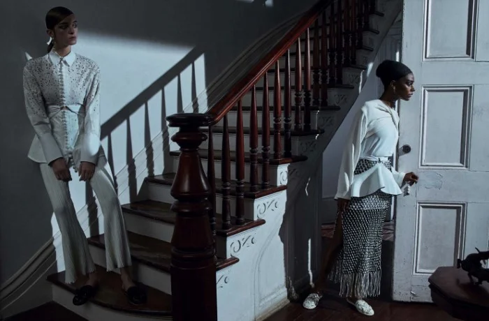 /Models Karly Loyce and Jamilla Hoogenboom wear 'Lady Lace' a romantic ode to fashion elegance styled by Natasha Royt. Photographer Emma Summerton flashes the sensual shadows for Vogue Germany March 2016./ Hair by Tamara McNaughton; makeup by Marla Belt