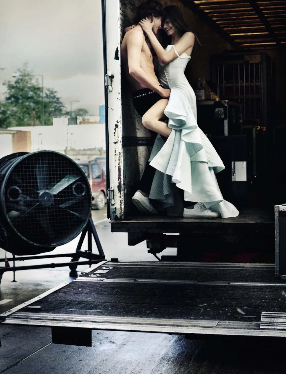 /Model Anna Mila Guyenz gets cozy with Jordan Barr in 'Giggle', styled by Sarajane Hoare. Mario Testino captures the lovebirds for Vogue Italia February 2016./ Hair by Sam McNight; makeup by Val Garland