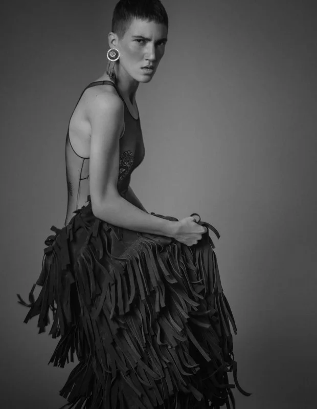 /Androgynous Swiss model Tamy Glauser wears an edgy mix of furs and fringes styled by Sonia Bedere. Photographers Thierno Sy & Raphael Delorme are in the studio for Harper's Bazaar Kazakhstan February 2016./ Beauty by Angelik Iffennecker