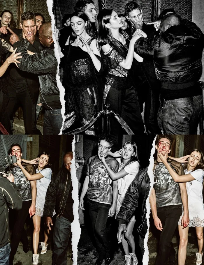 /Models Mariacarla Boscono, Jamie Bochert, Greta Varlese, Adam Auslander, Chris Gray, Luca Jamal, John Kolic, Rob Lelle, Shawn Lindo, Damien Medina, Sean Morales, Tyson Oaki, Laurence Rodriguez, and Dominic Weir are styled by Karl Templer wearing Givenchy by Riccardo Tisci. Photographer Fabien Baron captures the fashion frenzy for Interview Magazine February 2016./ Hair by Duffy; makeup by Marla Belt