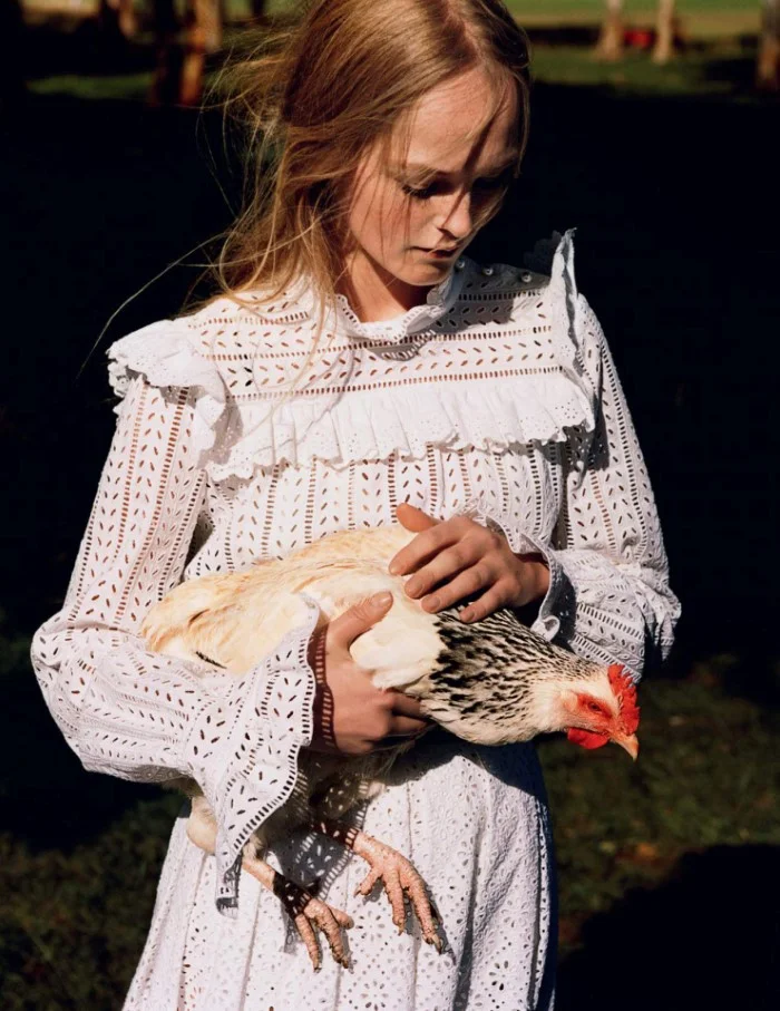 /Model Jean Campbell enjoys the 'Country Life', styled in pretty fancy prairie-girl looks by Kate Phelan. Photographer Alasdair McLellan captures the bucolic beauty for Vogue UK March 2016./ Hair by Duffy; makeup by Lynsey Alexander
