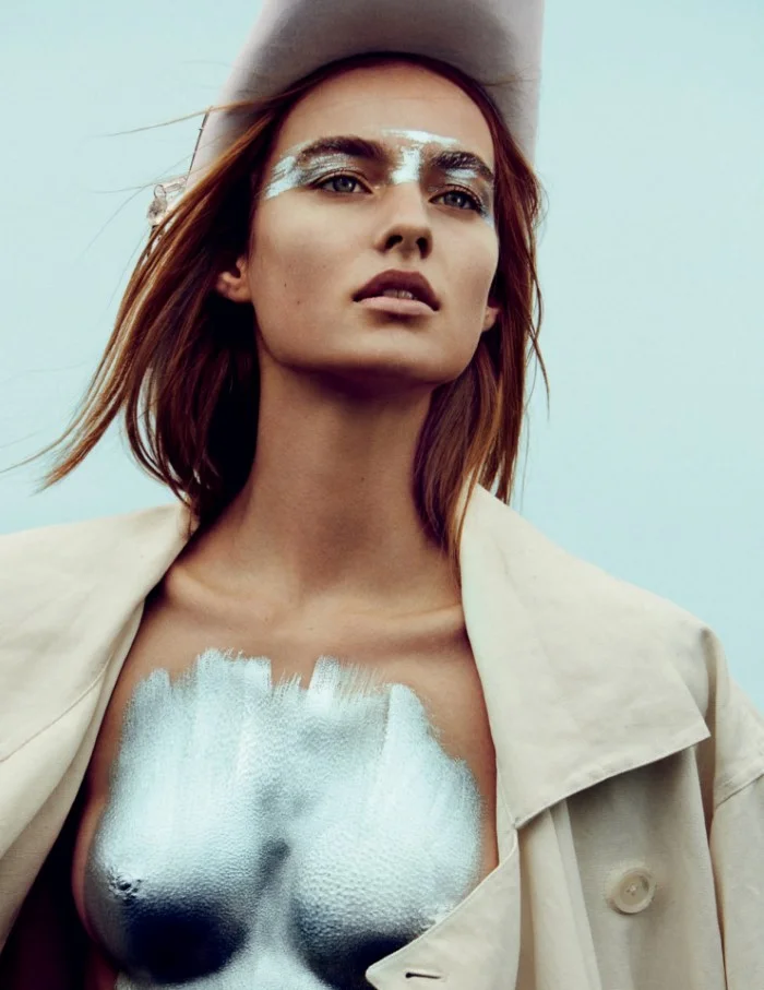 /Model Maartje Verhoef is styled by Olga Dunina in sporting elegance with utilitarian details. Txema Yeste captures Maartje in flamboyant images for Vogue Russia April 2016./ Hair by Laurent Philippon; makeup by Victor Alvarez