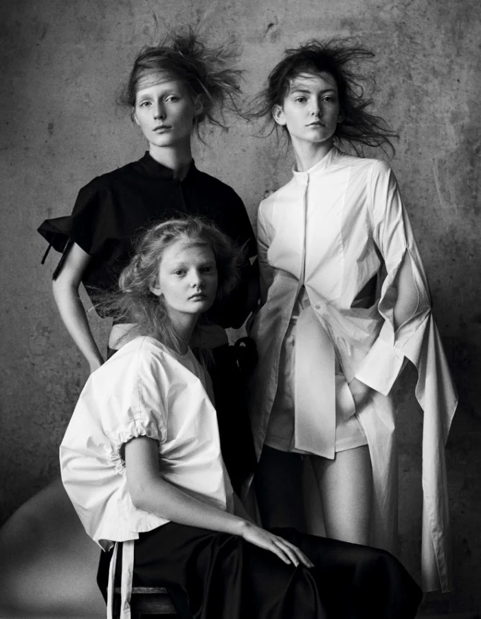 /Three smart girl beauties -- Allyson Chalmers, Julita Formella, and Unia Pakhomova -- are in the studio, styled by Hannes Hetta. Photographer Julia Hetta captures the trio for Dazed Magazine Spring 2016./ Hair by Kei Terada; makeup by Adrien Pinault