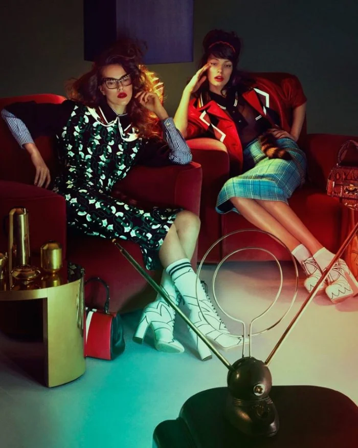 /Channelling decades past with retro fashion and furnishings styled by Millicent Simon, models Marcele, Josefien and Alexandra are lensed by Andrew Yee in glorious technicolour images for the Financial Times.