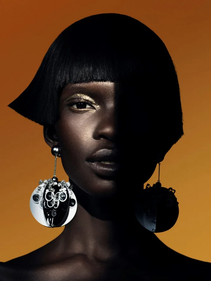 /Model Achok Majak weara high-impact jewelry styled by Connie Berg. Photographer Yulia Gorbachenko flashes Achok for Harper's Bazaar Kazakhstan May 2016./ Hair by Greg Bitterman; makeup by Eric Polito