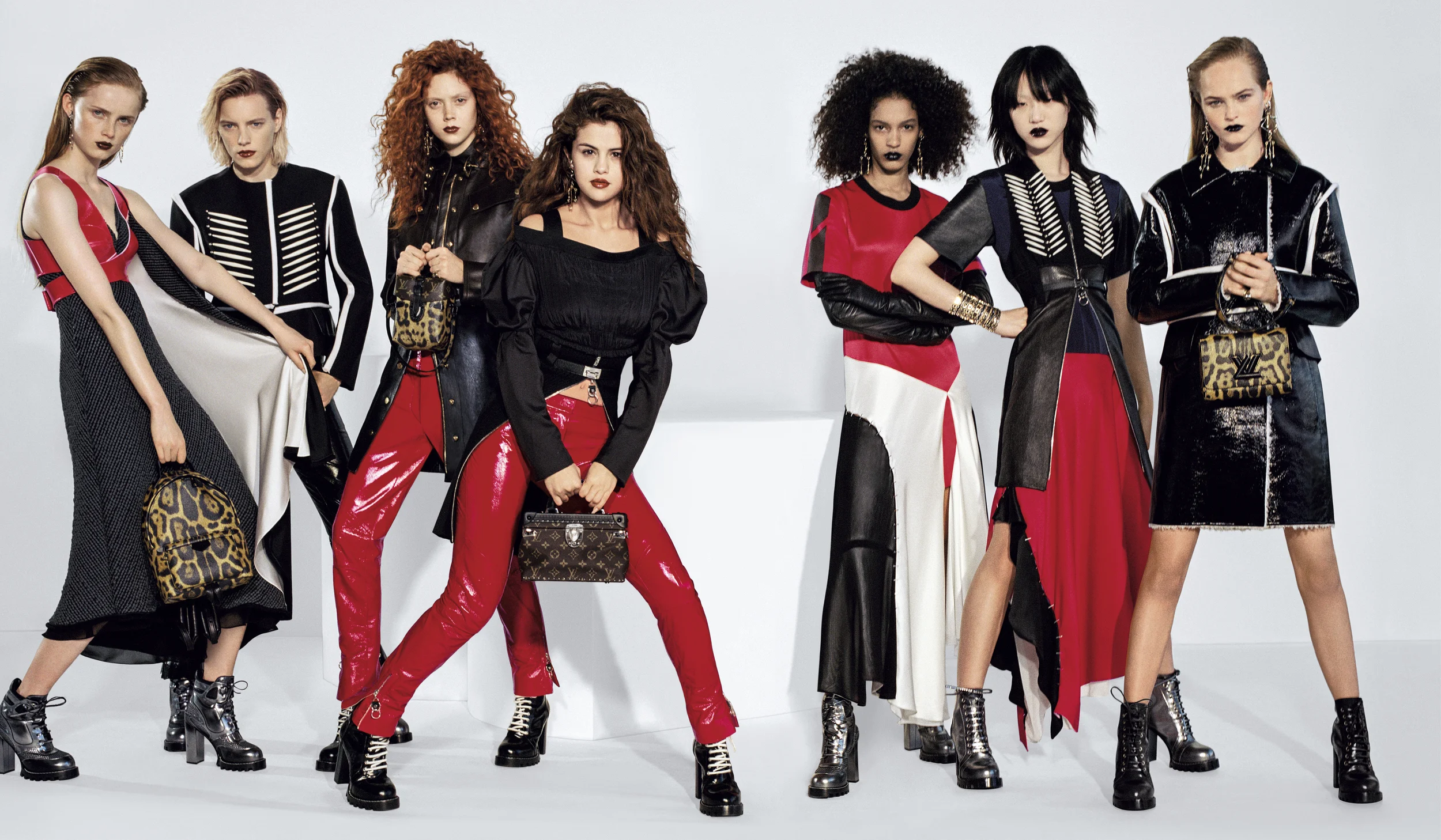 /Models Jean Campbell, Sora Choi, Luisana Gonzalez, Erika Linder, Rianne van Rompaey, Natalie Westling and talent Selena Gomez are world-tour ready, styled by Marie-Amélie Sauvé. Photographer Bruce Weber is behind the lens for Louis Vuitton Fall 2016./ Hair by Paul Hanlon; makeup by Peter Philips