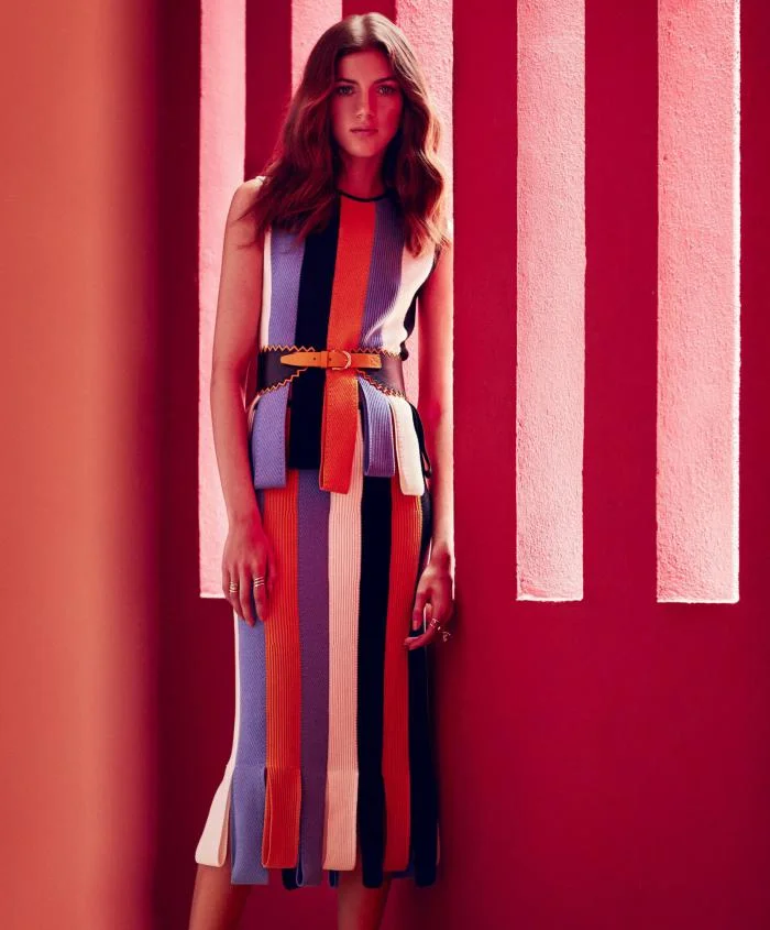 /Model Valery Kaufman is styled in a series of fashionable 'Bright Ideas' by Joanna Hillman. Photographer Daniel Riera captures the tailored colorama for Harper's Bazaar US September 2016./ Hair by Seb Bascle; makeup by Maria Martinez