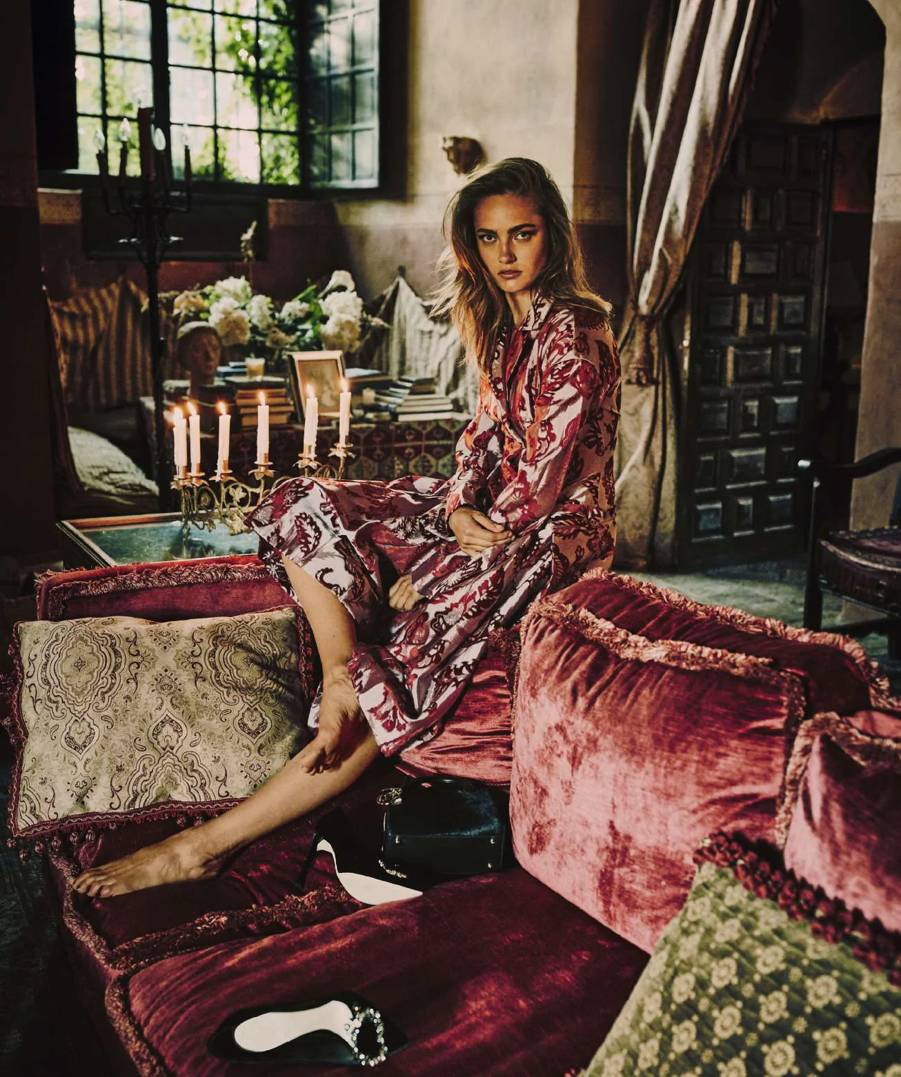 /Top model Karmen Pedaru is styled by Beatriz Moreno in 'Autumn Sun', a visually lavish fashion projection lensed by Guy Aroch for Harper's Bazaar Spain August 2016./ Hair by Halley Brisker; makeup by Charlotte Willer