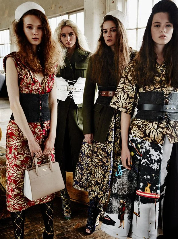 /Fashion photographer David Roemer captures fall's new looks in this eclectic fashion mix styled by Jayne Pickering. Models front looks from Gucci, Prada, Boss, Louis Vuitton, Chanel, Chloe, Celine, Dior, Fendi, Valentino and more in 'The Fall' for Marie Claire UK September 2016./ Hair by Oliver Lebrun; makeup by Gina Kane