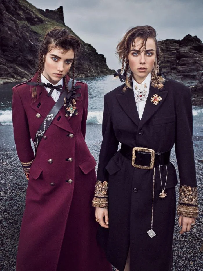 /Models Edie Campbell & Grace Hartzel are styled by Tabitha Simmons with military precision in 'Major General'. Photographer Mikael Jansson captures the duo for Vogue US September 2016./ Hair by Eugene Souleiman; makeup by Hannah Murray