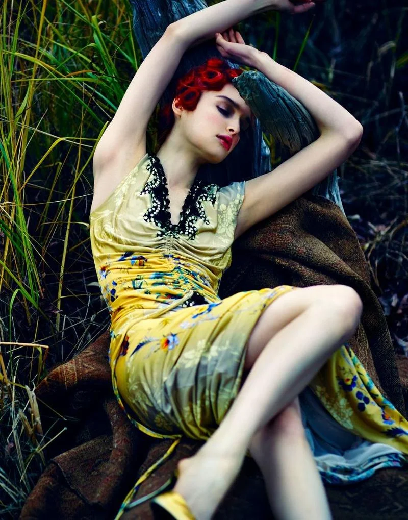 /Model Rhiannon McConnell enjoys her own company in 'Before Sunset', a mellow fashion story infused with yellow and blue styled by Anna Katsanis. Photographer Hao Zeng flashes Rhiannon for Vogue Brazil September 2016./ Hair by Takuya Sugawara; makeup by Misha Shahzada