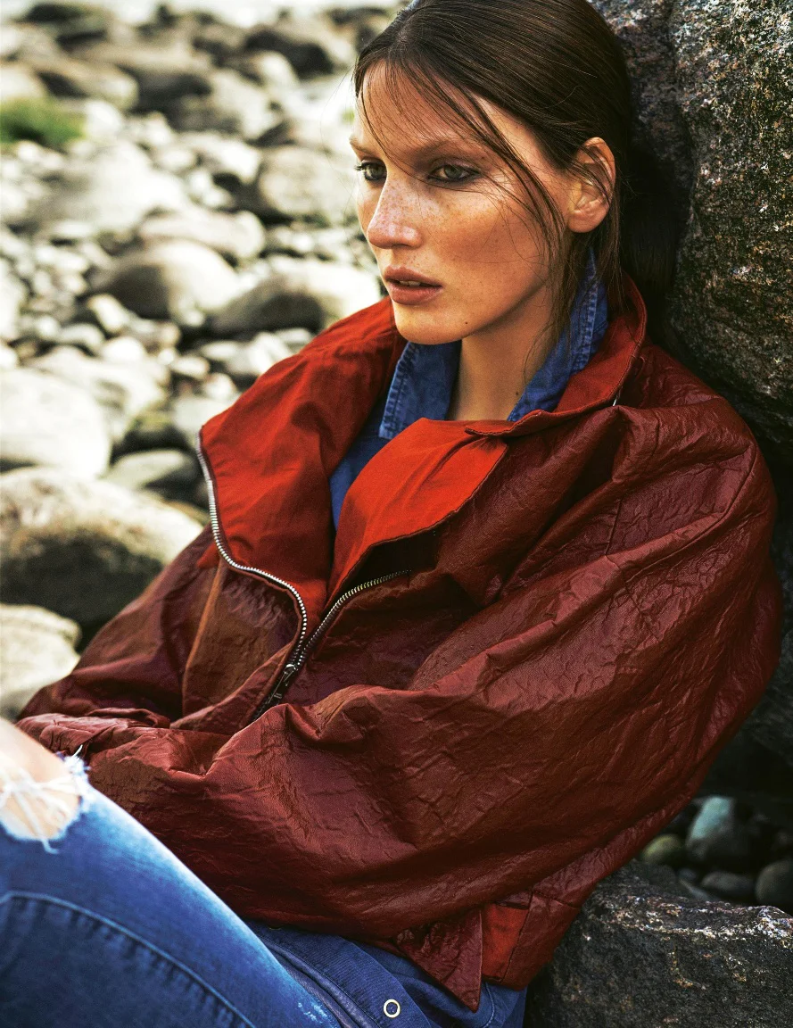 /Model Veroniek Gielkens is layered in denim and other casual fashion components in 'The New Forms of Blue', styled by Tamara Gianoglio. Photographer Zoltan Tombor captures the solitary nature girl for Grazia Italia August 30th, 2016./ Hair & makeup by Elena Pivetta
