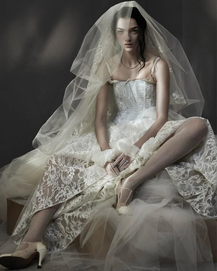 /Iconic model Mariacarla Boscono redefines the concept of a blushing bride, styled in Marie Antoinette-worthy luxe bridal looksby Carine Roitfeld. Photographer Katja Mayer captures the ivory opulence and seductive sensuality for CR Fashionbook #9 Fall 2016.