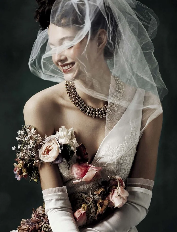 /Model Marylou Moll is styled in heavenly bridal looks by Elisa Zaccanti. Photographer Kiki Xue captures the painterly, fall-forward elegance as 'In Fiore' for Vogue Italia Sposa January 2017.