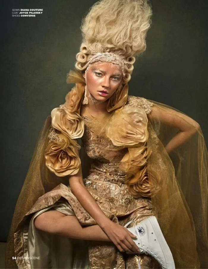 /Model Alanna Whittaker graces Design SCENE Magazine's January/February issue, lensed by F&G. Francis Ocon styles the 'Decadence' story, channeling golden-hued Marie Antoinette selects from Furne One Couture, Diana Couture, Joyce Pilarsky, Converse, Azadeh Couture, and Zhang Jing Jing Couture.
